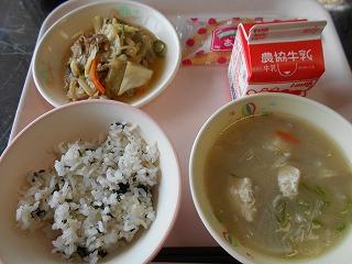 ↑ 豚肉の生姜炒め、けんちん汁、わかめごはん、いちごクレープでした。生姜が加わると香りも良く、食欲がわいてきます。ごぼうの風味が口の中でふんわり漂う、おいしいけんちん汁でした。