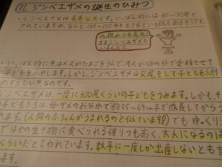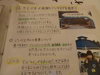↓ 5年生の「水族館の人気者!、ジンベイザメの知られざる不思議」は、ジンベイザメのことをまず本で調べ、そこで興味を持ったこと、もっと知りたいことなどを調べるために、実際にのとじま水族館を見学し、水族館のバックヤードを見せてもらって、見たり聞いたりしたことを丁寧にまとめてありました。自分が作品の中心にあり、読み手が、もっと知りたいと感じて、どんどん次のページをめくりたくなるような作品に仕上がっていました。