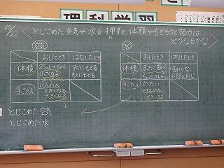 ↓4の2 理科 空気と水を注射器に閉じ込めたときの手ごたえや体積を比較しました。では、水と空気を半分ずつ注射器に入れた場合は、どうなるのでしょうか。根拠と理由をつけて予想を話すことで、論理的思考が育ちます。