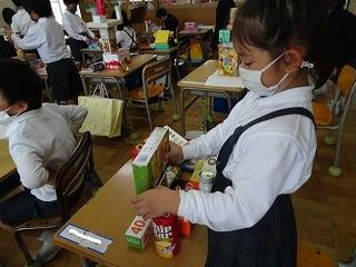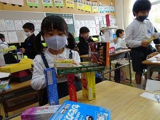 ↓1の3 算数 身の回りの箱を集めて、形遊びです。子供たちは、遊びながら、箱の特徴を捉えていきます。茶筒のような形や、サイコロの形、長四角など、いろいろな特徴に気づいていきます。