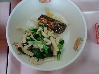 ↓今日の給食です。さんまのおかか煮、小松菜の煮浸し、塩肉じゃがでした。今日も栄養たっぷり、青い魚と、牛肉、野菜もたっぷりあり、栄養バランス満点です。
