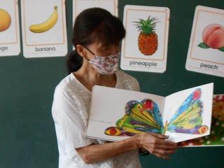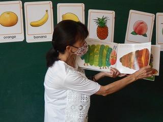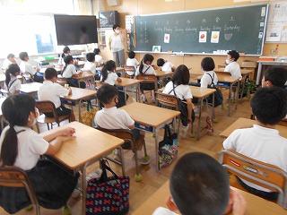 ↑2の3 外国語活動で「はらぷこあおむし」の読み聞かせを聴いています。?!英語での読み聞かせです!外国の子供たちも、こうやって、初めは読み聞かせをしてもらって、英語に親しんでいくのでしょうね。先生は(当然ですが)英語がとても上手でした!