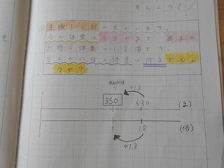 ↑5年2組 少人数 算数 2つの数直線は必ずかいて、何倍になっているか関係を把握しています。数直線に表すと立式の意味が分かります。