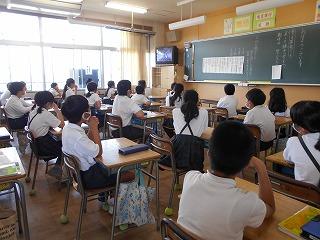 ↑ 朝学習で、新しい学校生活での「読み聞かせ」です。本来ならば図書ボランティアさんが教室に入って読み聞かせをしてくださり、子供たちは大変楽しみにしている時間です。しかし、新型コロナウィルスの影響で、今回は、全校一斉のテレビ放送での読み聞かせです。全学年の心に響くお話として選んでくださった本は「幸せの王子」。王子はつばめさんに頼んで、金色でできた自分自身の像の一部を、困っている人に運んでもらい、とうとう、王子の心臓だけになってしまいましたが、天の神様は、その様子を見て、心臓とつばめを天高く上げ、星座されたというお話でした。読み聞かせの時間は、学校中が静まり返って、「幸せの王子」のお話に聞き入っていました。全校児童が心豊かな一時を過ごすことができました。図書ボランティアの皆様、ありがとうございました。
