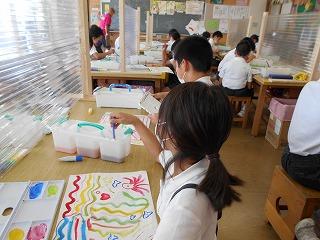 ↑ 4年図工 いろいろな模様を描いて、そこから何が生まれてくるかな?偶然から、豊かな発想で新たな世界を生み出す図画工作の時間です。出来上がりが楽しみです。