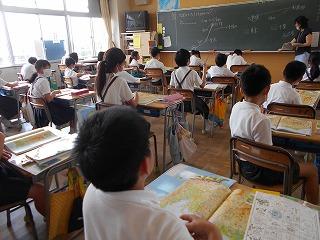 ↑ 4年社会 地図を読む学習です。地図では7cm離れた土地ですが、縮尺をよんで計算すると、実際の距離が分かるのです。縮尺を読む学習をしました。