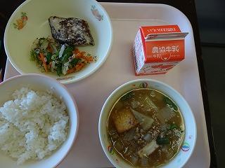 ↓今日の給食は、さばの竜田揚げ、ゆかり和え、大根と揚げのそぼろ煮でした。