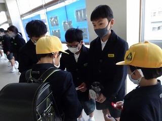 ↑玄関で見守りをしてくださっている校務員さんに、礼儀正しいあいさつをしています。すてきなあいさつで、心が温かくなります。