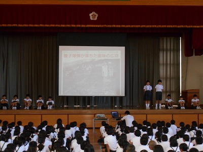 次の「平和を考える集会」では,計画委員会の発表と図書委員会の絵本「えんぴつびな」の読み聞かせで戦争の恐ろしさや平和について考えました。
