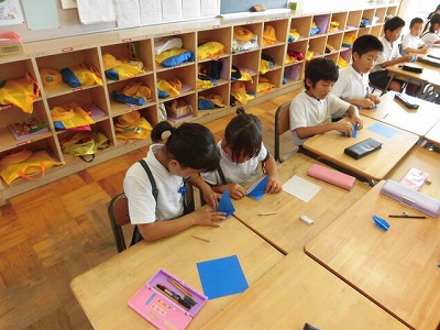 子ども達は,夏休み中ですが,元気よく登校してきました。今日は,学校集会と平和を考える集会,なかよしグループでの折りづる作りが中心でした。