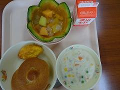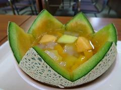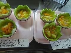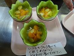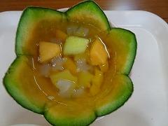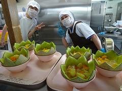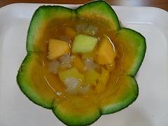 ↓出来上がりましたよ~メロンの皮を器にしたおしゃれなフルーツポンチ!星形メロンのフルーツポンチ、ナタデココもなんと星形に型抜いてありました!味も、もちろん最高です!‼ 調理師さんの子供たちを思う愛情がたっぷりですよ。ありがとうございます。