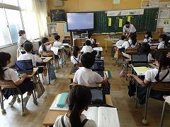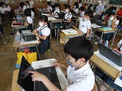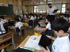 ↓2年1組 国語科の研究授業です。スイミーが「すごいな」と感じたところを見つけ、その理由を交流し合いました。クロームブックを使って、すごいなあと感じた教科書の部分を写真に撮ってオクリンクし、グループ分けをしていきました。その後、マイブックを使って、「すごいなあ」と思うところを見つけました。子供たちは、クロームブックに随分使い慣れてきていました。毎日使っていると、上達は早いです。