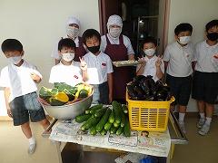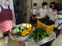 ↓1学期最後の給食は、「みんな大好き夏野菜カレー」です。新鮮な食材が届きました。調理師さんが、食材を披露してくださいました。ドーン!これはズッキーニです。石川産の新鮮でみずみずしいズッキーニがたくさん届きました。