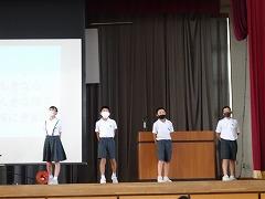 ↓私からは、①平和のお話、②夏休みも「継続は力なり」③夏休みも自の命は自分で守るお話をしました。「折り鶴」に込められた平和の思い、自分にできる平和は「隣の人にやさしくすること」であること、ゲームのし過ぎにより「ゲーム障害」といって脳に変化が起きてしまうこと、校庭に咲いている「むくげ」の花言葉は「信念」で、「条南子にやり通してほしい」というメッセージが込められていること等をお話しました。