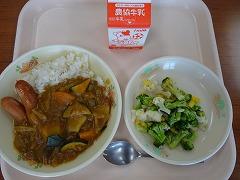 ↓夏野菜カレーの出来上がり!カボチャやズッキーニ、ナスが彩よく盛り付けられています。給食のカレーは最高においしいカレーです。子供たちも大喜びです。花野菜サラダも身体の調子をよくしてくれるメニューです。1学期間、おいしい給食のおかげで元気に過ごすことができました。ありがとうございました。