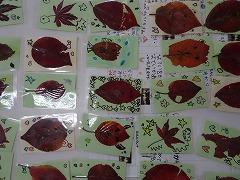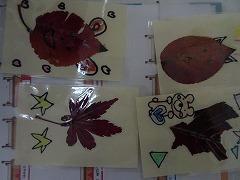 ↓1年 きれいな葉っぱで秋のしおりが出来上がりました。創造力を働かせ、とってもかわいいしおりにできあがりました。