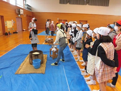先週の土曜日に5年生の親子授業がありました。5年生は,総合の学習で育てたもち米を使って,もちつきをしました。