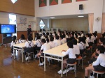 最初はランチルームで警察の方のお話を聞いたりビデオを見たりして交通ルールを学びました。