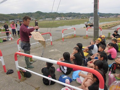 田植えのやり方を真剣に聞く5年生。