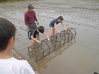 田植えを教えてくださる先生とPTAの方にお手伝いをしてもらい,「かぐら」というもち米の苗を植えました。