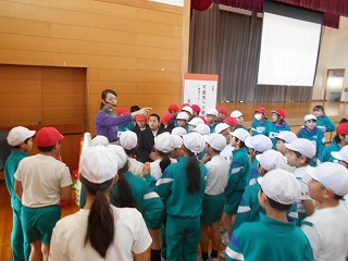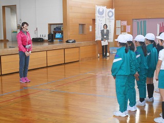 今日,オリンピアの室伏由佳さんが来校されました。5年生は一緒に体を動かし,楽しく授業をしました。