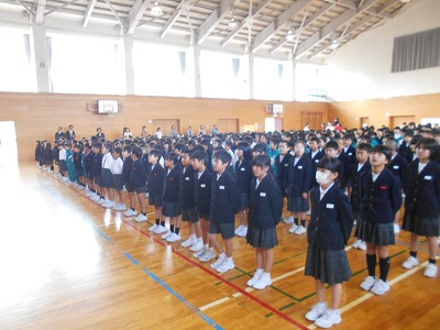 月曜日に5月の学校集会がありました。1年生も学校生活に慣れて,全学年がそろっての初めての学校集会。学校集会のスタートは校歌から始まります。