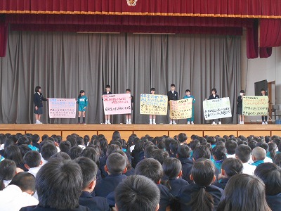計画委員会が司会をして,委員会発表や今月の歌を歌います。