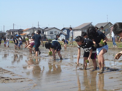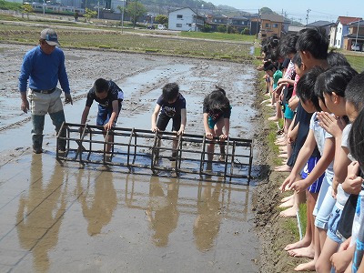 なかなか経験できない「わく転がし」を体験しました。昔の田植えの方法を知りました。土の感触を楽しみながら頑張っていました。