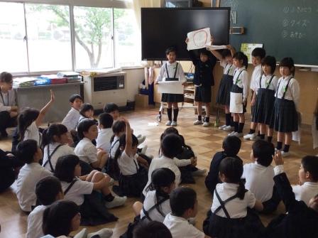 2年生が3つのグループに分かれ、国語で学習した「ふきのとう」の音読と、1年生に教えてあげたいことをクイズにした「学校クイズ」、そして、なかよくできる「あそび」をしました。