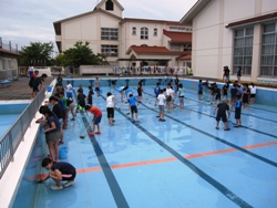 晴天の下、そうじをしてくれた6年生とプール開きを行いました。