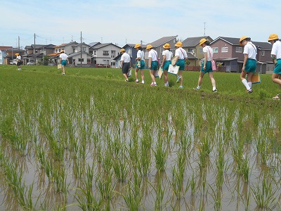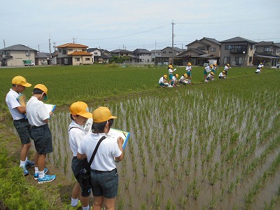 今日,総合の時間に学校田の観察に行きました。
