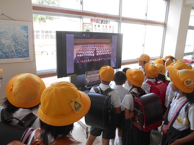 児童玄関で昨日の音楽会の様子をテレビで流しました。