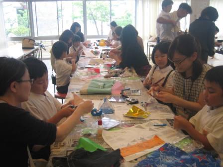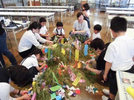 親子で協力して七夕飾りを作る様子はほほえましく,見ているほうも