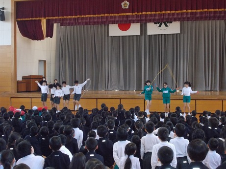今まで練習してきた縄跳び技を全校の前で披露しました。