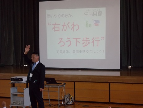 「思いやりの心が、右がわろう下歩行 で見える、条南小学校にしよう」