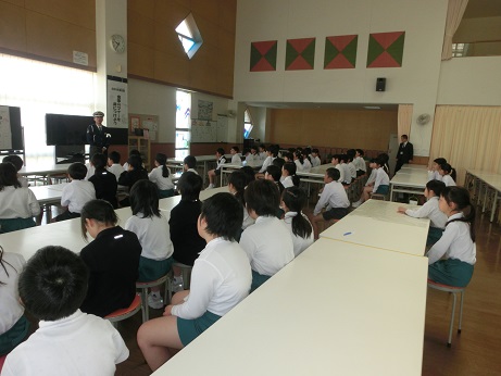 2・3時間目に交通安全教室が開かれました。警察の方から話を聞いて、ビデオを見た後に、グループに分かれて学校の周辺を実際に歩行しました。
