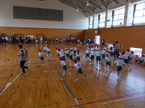 保護者の方の担いだかごに一生懸命追いかけて入れていました。