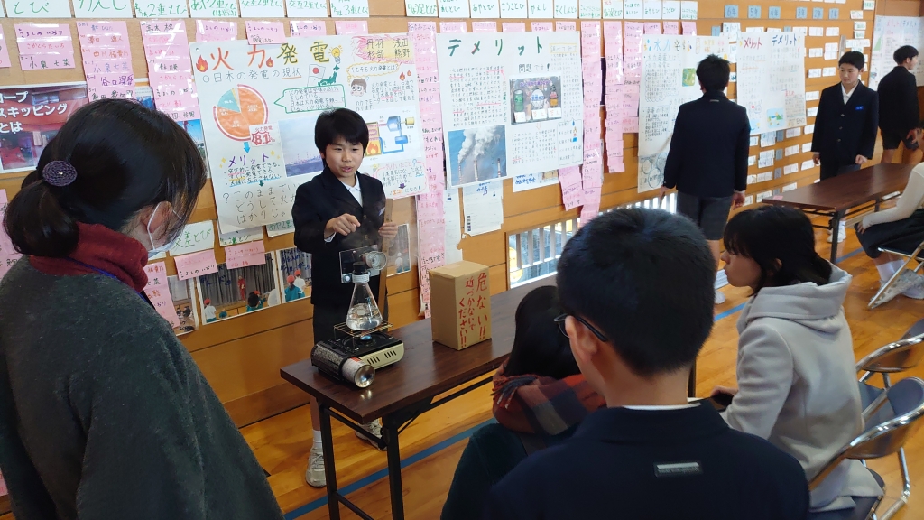 ガスコンロで水を沸騰させて、それからでる水蒸気の勢いでタービンを回すモデル実験を提示しながら、火力発電について説明していました。
