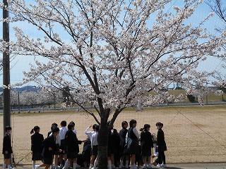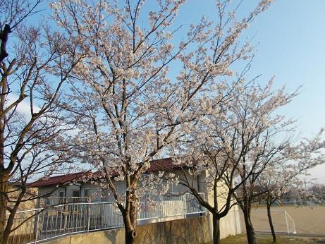 ↓中条公園方面から見た条南小学校です。見事な桜です。