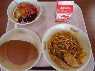 ↑ 今日のメニューは、スイカ入りのフルーツポンチ、スパゲティーミートソースにチキンナゲットにバターロールです。いつものフルーツポンチはバナナが入っていますが、今回は、バナナの代わりに、季節感たっぷりのスイカ入りなのです。