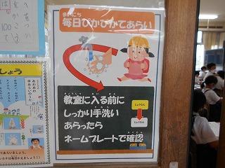 ↑ 教室・学校に、新型コロナウィルスを入れないために、手洗いを十分行っています。手洗いしたら、ネームを裏に返すことで、確実な手洗いに努めています。