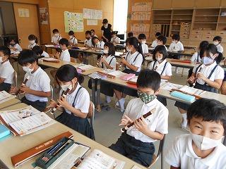 ↓ 3年1組 音楽 コロナ感染防止のため、リコーダーはまだ演奏できません音楽を聴きながら指づかいの練習をしています。3年生からリコーダーの学習が始まりますので、リコーダーの持ち方や姿勢を教わりながら、練習しました。