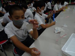 ↑2の1 2の3 図画工作「つくろう あそぼう くふうしよう」ストローと紙を使って飛ばすおもちゃを作りました。