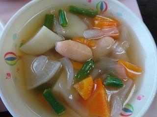 ↑「チリコンカン」とは、豆と肉をチリ風味でスパイシーに煮込んだ、アメリカ・テキサス生まれのメキシコ風料理のことをいうそうです。体に良い大豆をおいしくいただくことができました。卵スープは、どうしてこのようにふわふわになるのか、コツを教えてほしいと思いました。