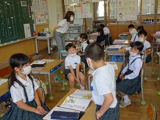 ↓ 運動会の練習を始めています。3年生・4年生の「条南のディスタンス」です。レースのルール説明を聞いて、練習してみました。