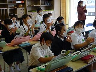 ↑5の2 音楽 鍵盤ハーモニカで和音の響きを味わう学習です。パートの音色が響き合い、美しい和音のハーモニーでした。