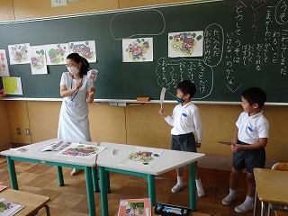 ↓ 1の3 道徳の授業をさせてもらいました。「ひつじかいの 子ども」という教材文で正直な心について、考えました。〈うそをつくと そんなきもちになるのだろう〉これは、役割演技をしているところです。ペープサートをもって、思いついたことを即興的に話しているところです。話している子も聞いている子も一生懸命考えてくれました。