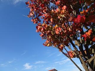 ↑中庭には、見事に赤く色づいた「どうだんつつじ」、真っ青の空に白い雲一つ、秋晴れの午後です。