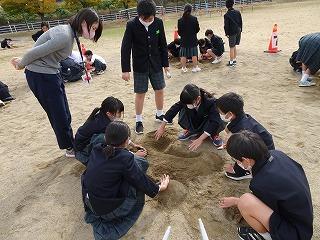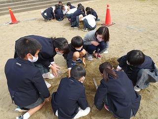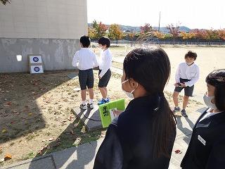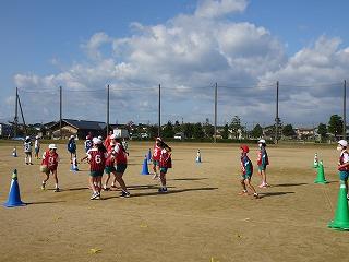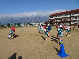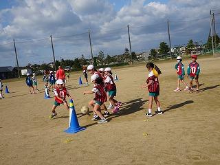 ↑4の2 体育 秋晴れ下、気持ちよく運動し、じょうぶな体を作っています。サッカーですが、HONDAをつかった作戦を、チームで工夫しました。HONDA作戦を紹介し、それを使っています。HONDA作戦とは、どのようなものか、4の2の保護者の皆さん、お子さんに聞いてみてください。とにかく、みんな集中して、自分がどのように動いたらよいか考え、チームプレーをしています。