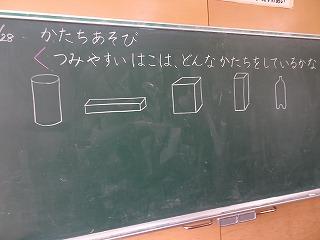 ↑1の1 こちらは、箱をつかっての算数です。どんな形があるか、積みやすい箱はどれか、体験を通して図形の概念を形成しています。
